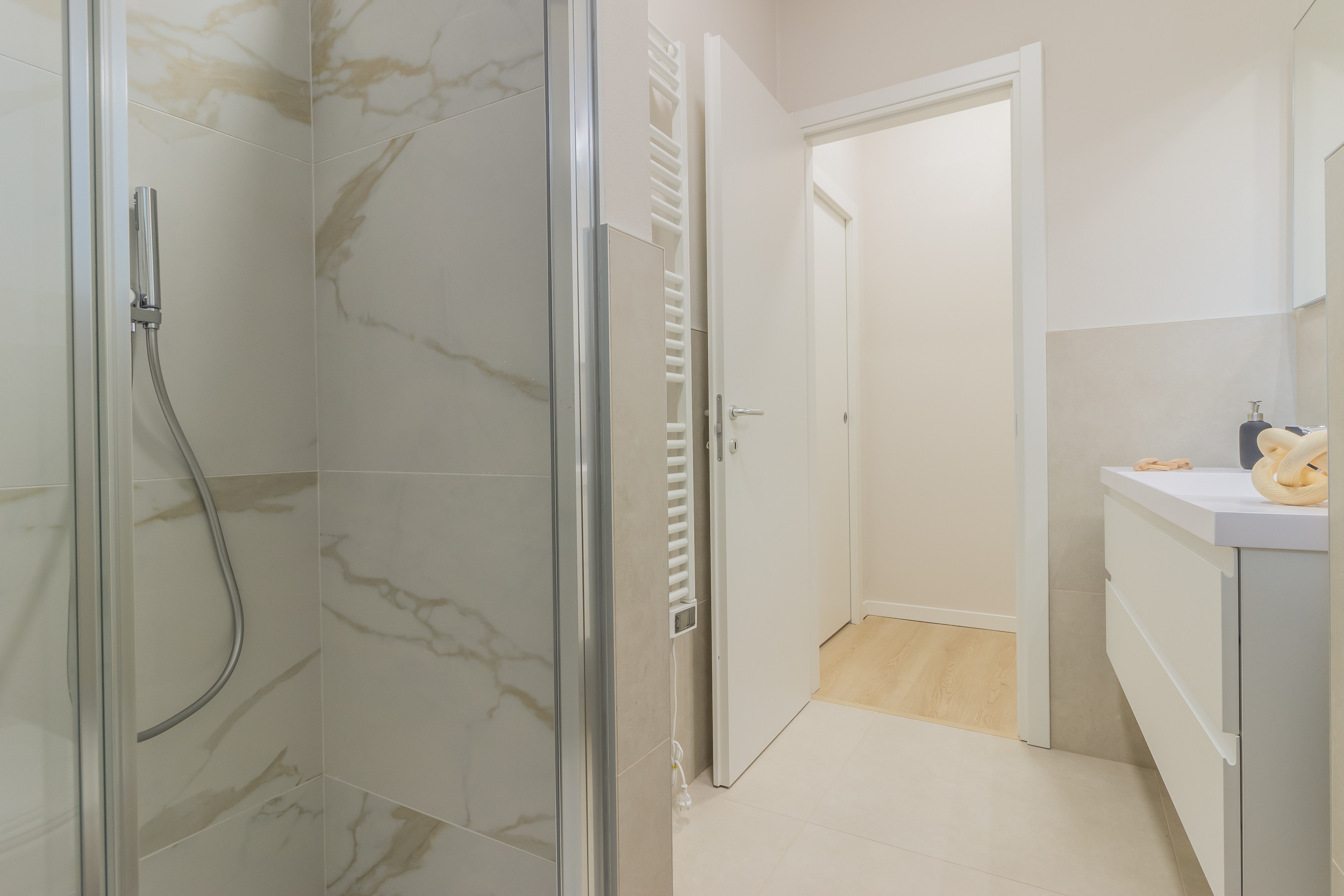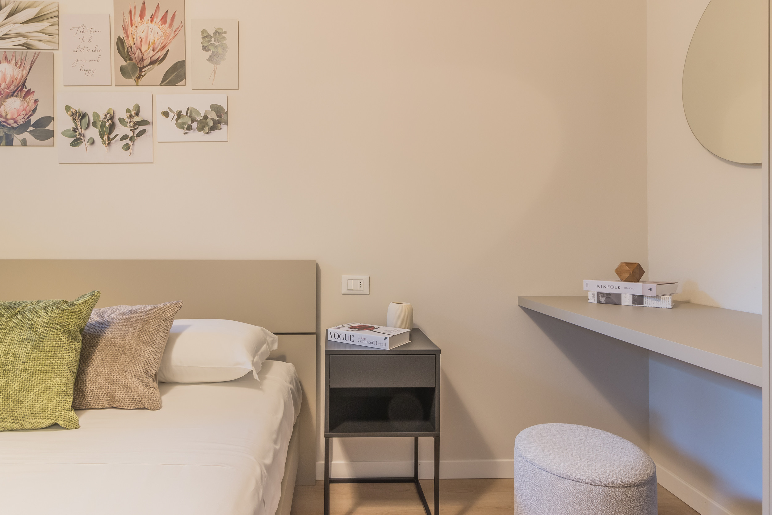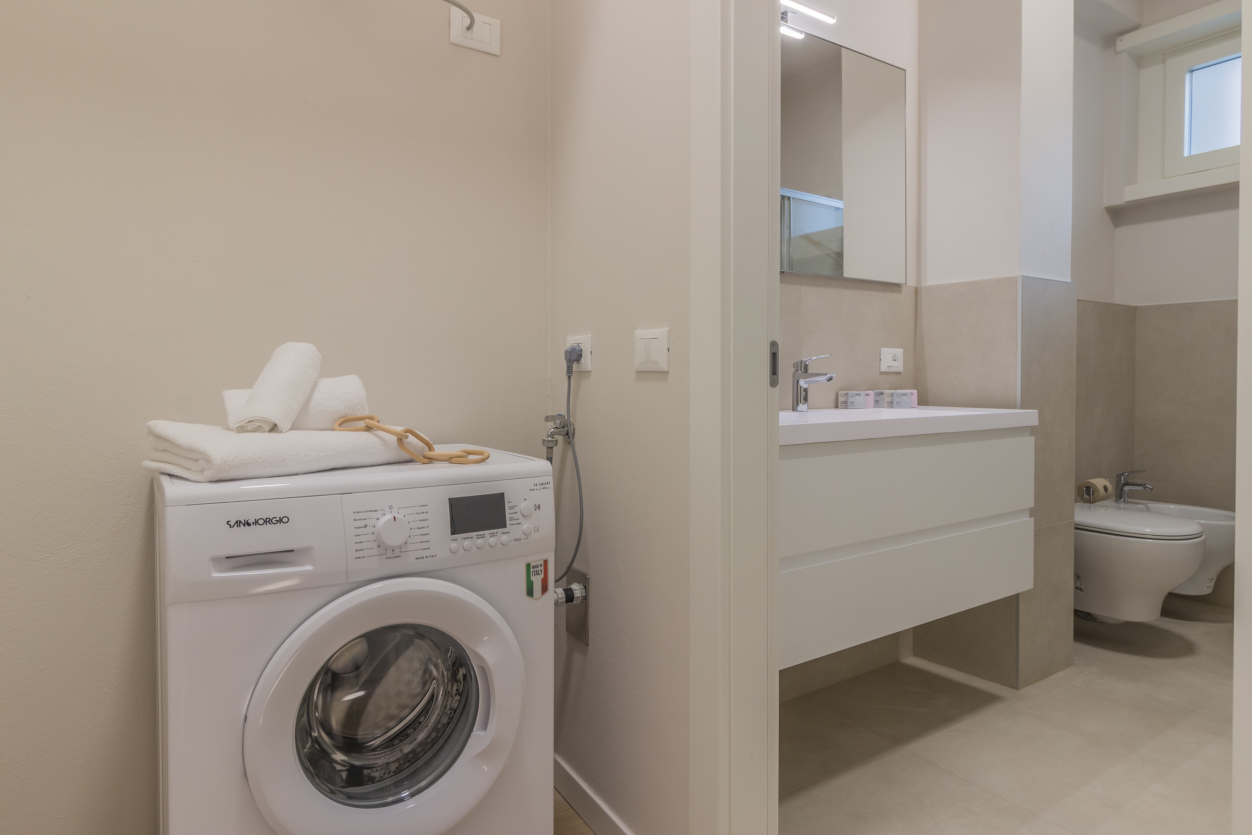 La zona notte è composta da una camera matrimoniale e un bagno, dotato di water, bidet, lavabo e doccia, nonché di una pratica lavatrice.