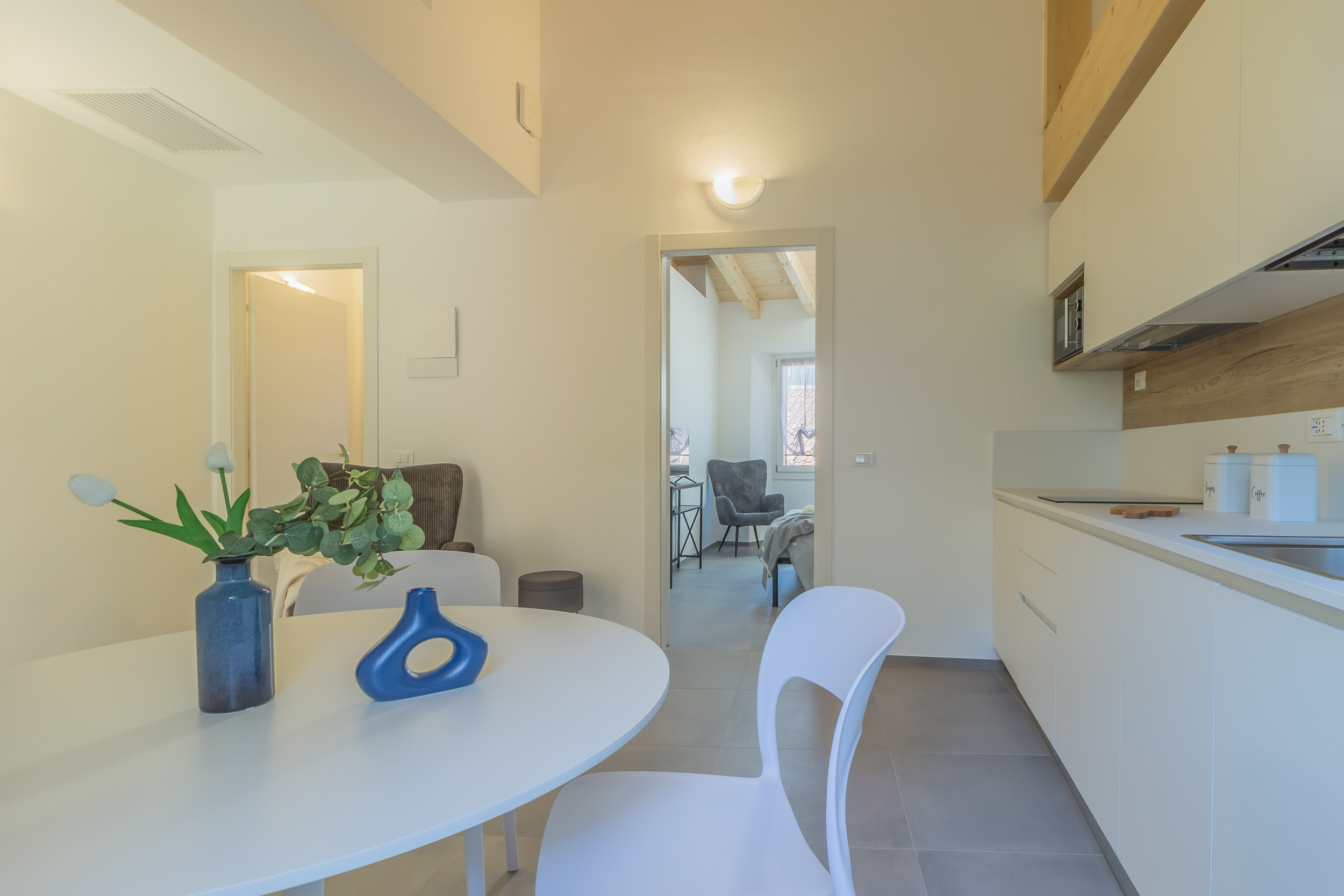 L’appartamento è disposto al primo piano e si apre sulla zona living, che presenta una comoda poltrona, il tavolo da pranzo e una grande cucina con fornello a induzione, attrezzata con lavastoviglie, microonde, bollitore, tostapane e tutti gli attrezzi necessari a preparare gustosi pasti.