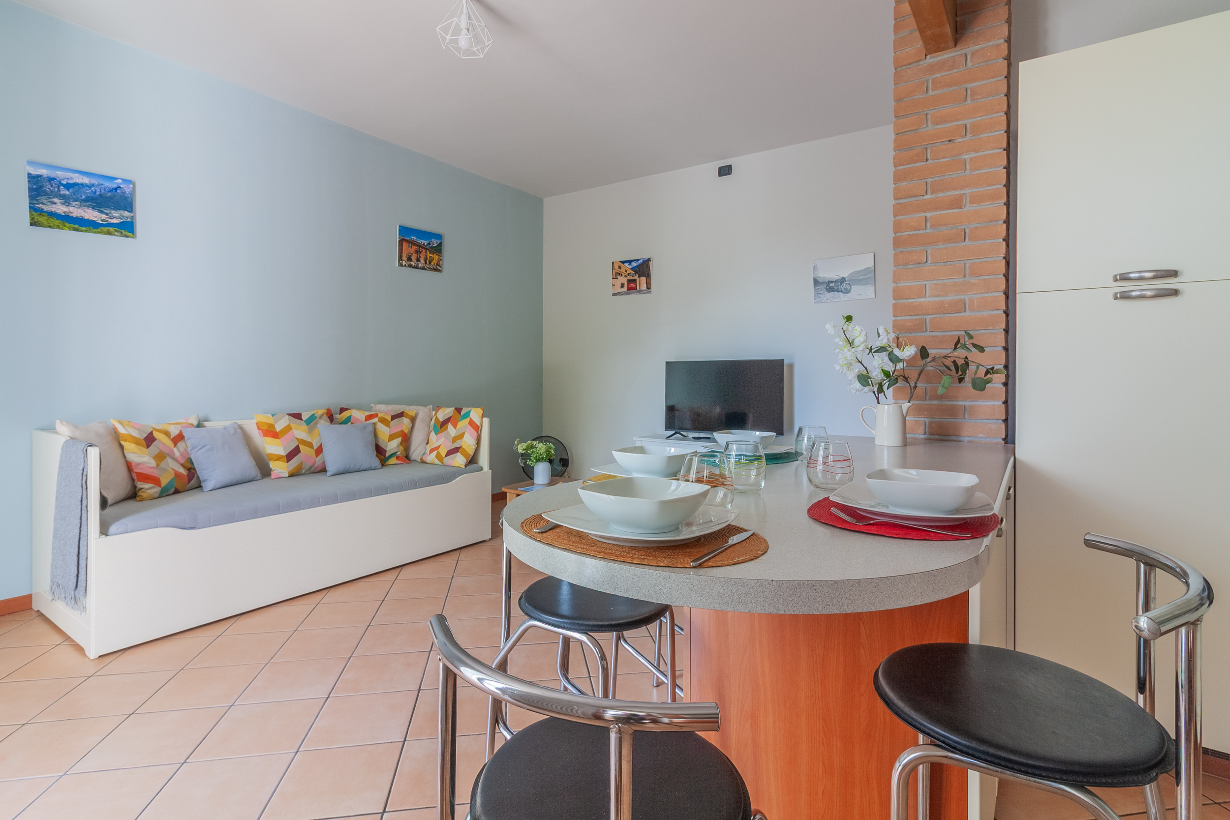 L’alloggio si apre sulla zona giorno open space dove si trovano il salotto, dotato di un comodo divano letto matrimoniale e di televisione, e la cucina, con un comodo bancone a isola che funge anche da tavolo da pranzo. La cucina è completamente attrezzata con attrezzi per cucinare gustosi piatti e con comodità quali lavastoviglie, forno, bollitore, microonde, tostapane e macchina del caffè. Da questa stanza si accede inoltre a un piccolo ripostiglio dedito a lavanderia, dove è presente una comoda lavatrice, stendino ed oggetti per la pulizia.