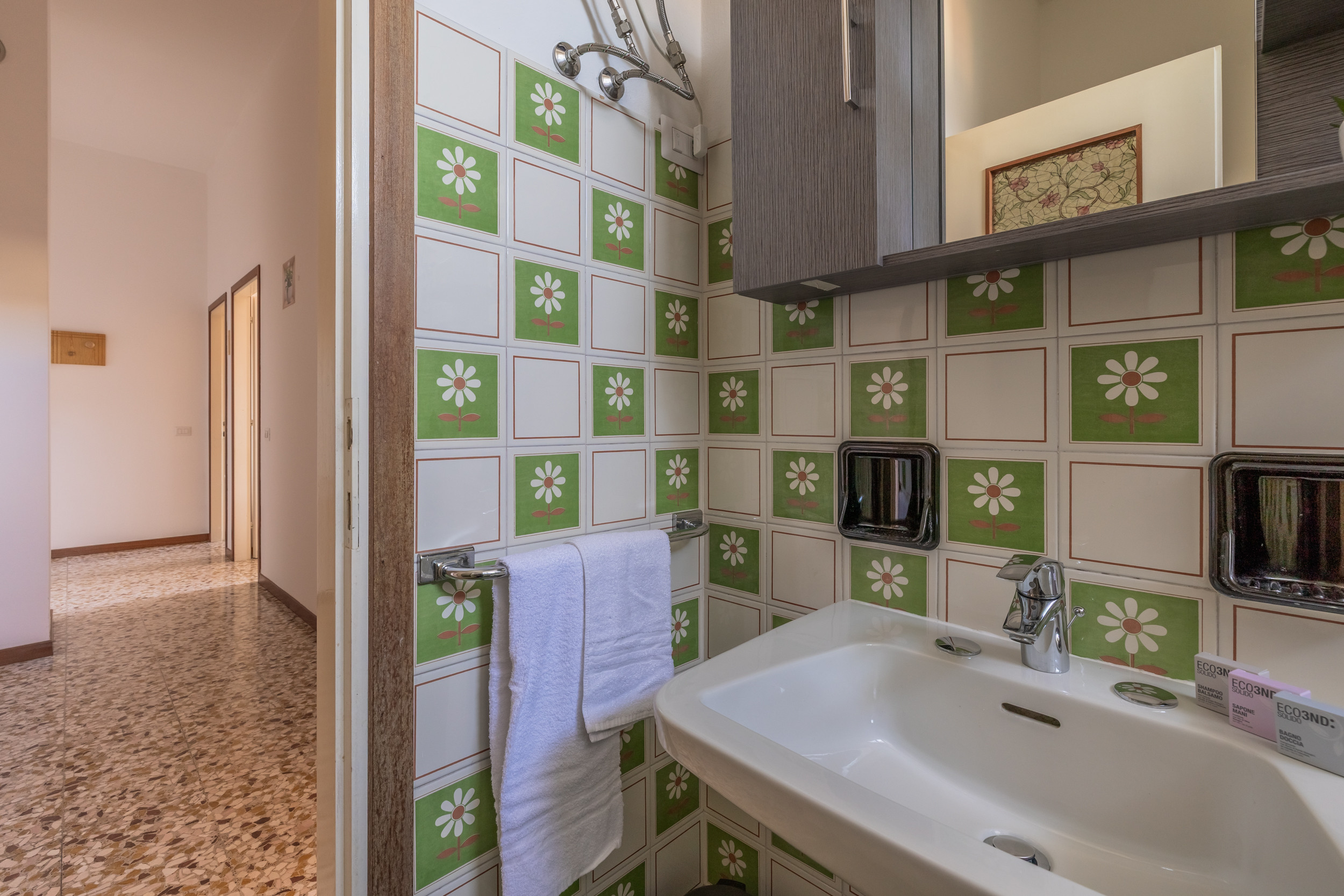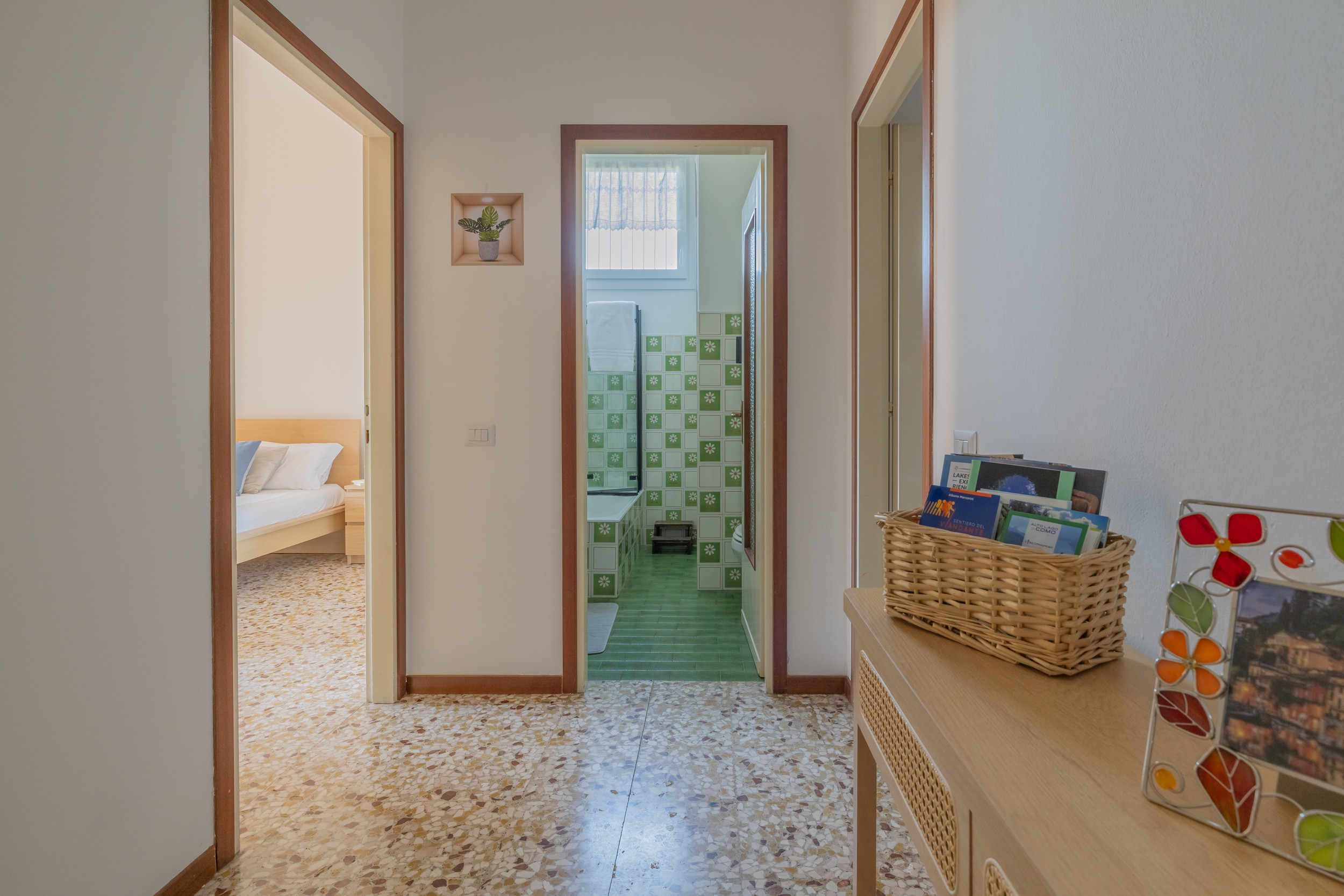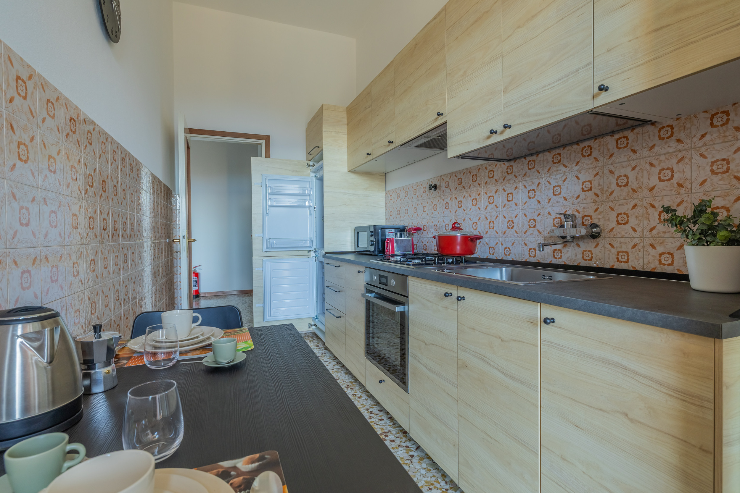 L’appartamento si apre su un corridoio che conduce dapprima alla cucina completamente attrezzata con forno a microonde, tostapane, bollitore, forno e tutti gli attrezzi per cucinare, oltre che un tavolo da pranzo.