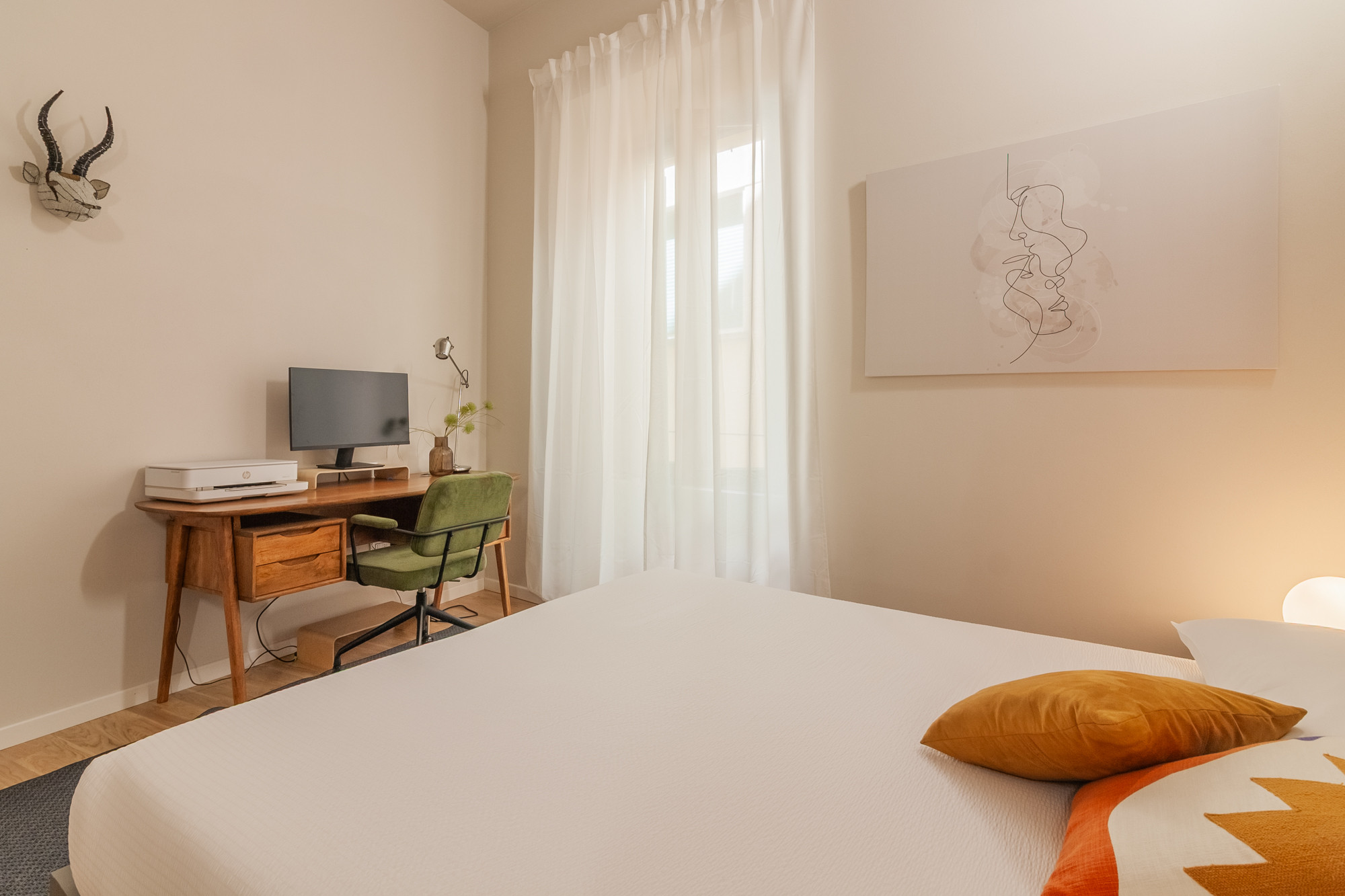 The apartment overlooks a quiet courtyard and features two large bedrooms (one with a king-size bed, the other with two twins), two modern bathrooms with premium finishes, and a comfortable sofa bed in the living area. The fully equipped kitchen with SMEG appliances is perfect for cooking shared meals, while the dining and lounge spaces, complete with a smart TV and sound system, offer the ideal setting to unwind after a day of exploring.