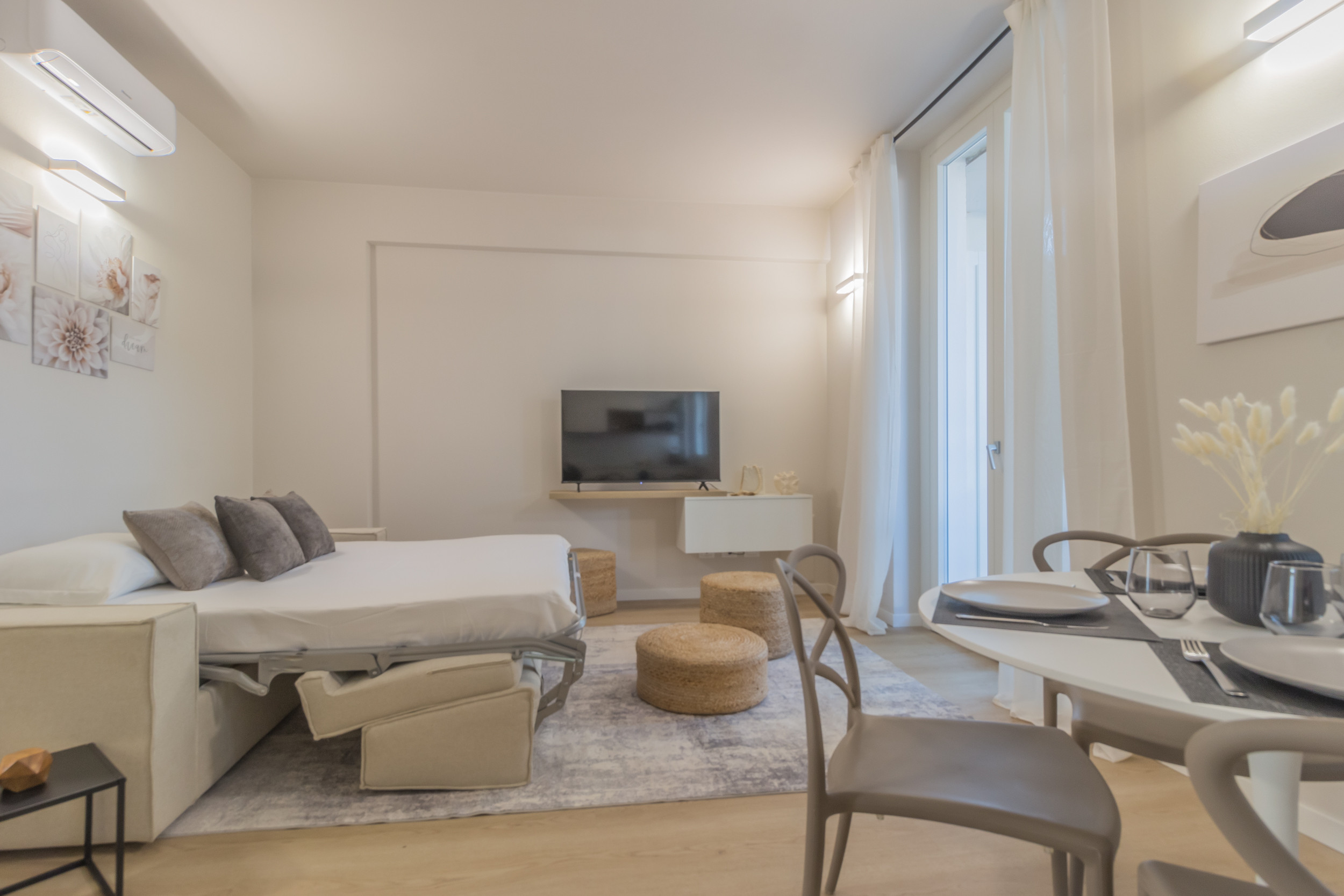The accommodation is located on the first floor of a condominium building overlooking the beach, a strong point of the apartment. The entrance opens onto the bright and well-furnished open plan living area, which includes the living room, equipped with a comfortable double sofa bed, and the kitchen, with dining table and fully equipped with induction hob, dishes, refrigerator, coffee machine, oven and everything needed to prepare delicious meals. From the living room it is possible to go out onto the balcony overlooking the Lido beach, ideal for enjoying a bit of a view of the lake and relaxing to the sound of the waves.