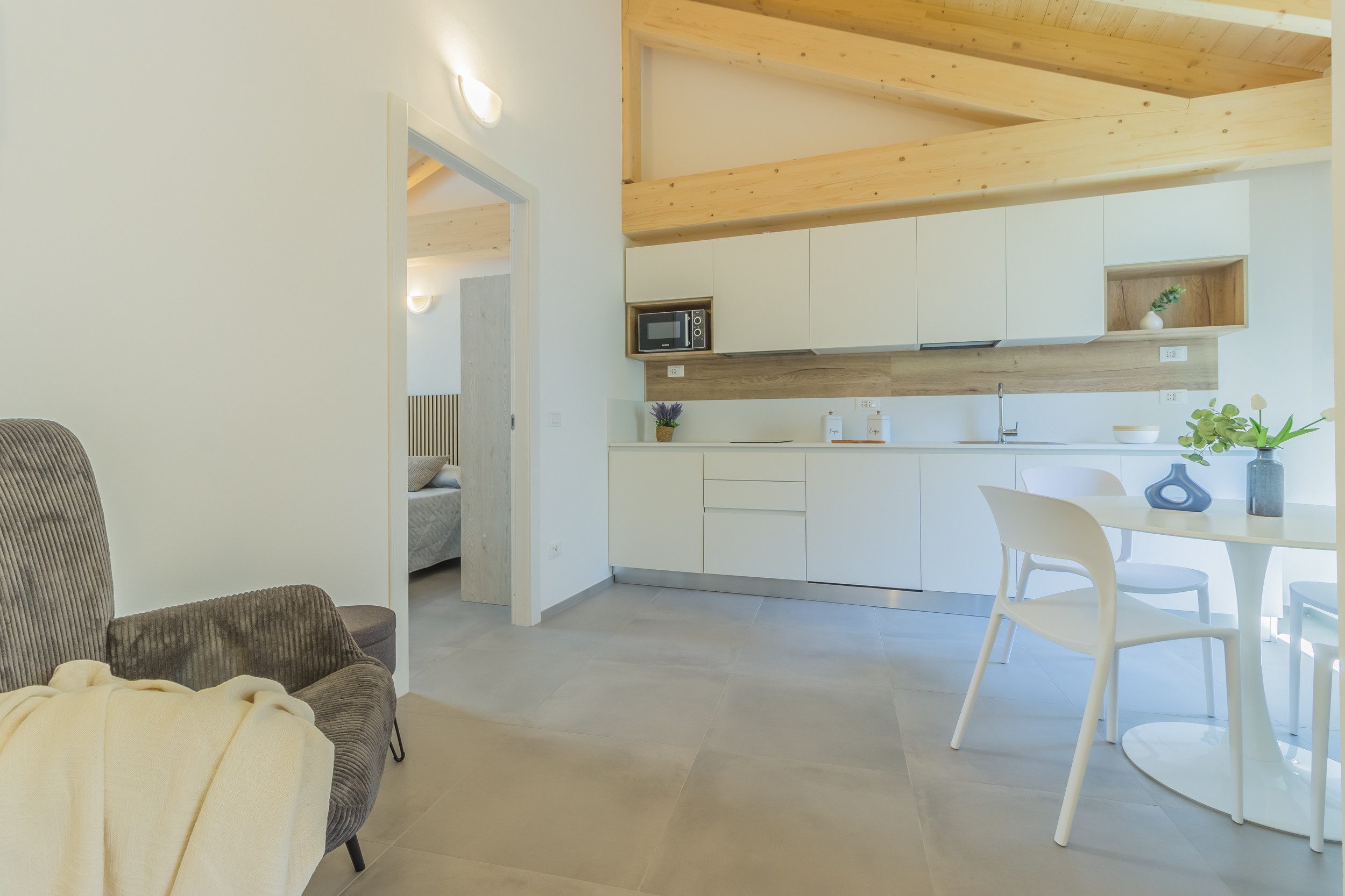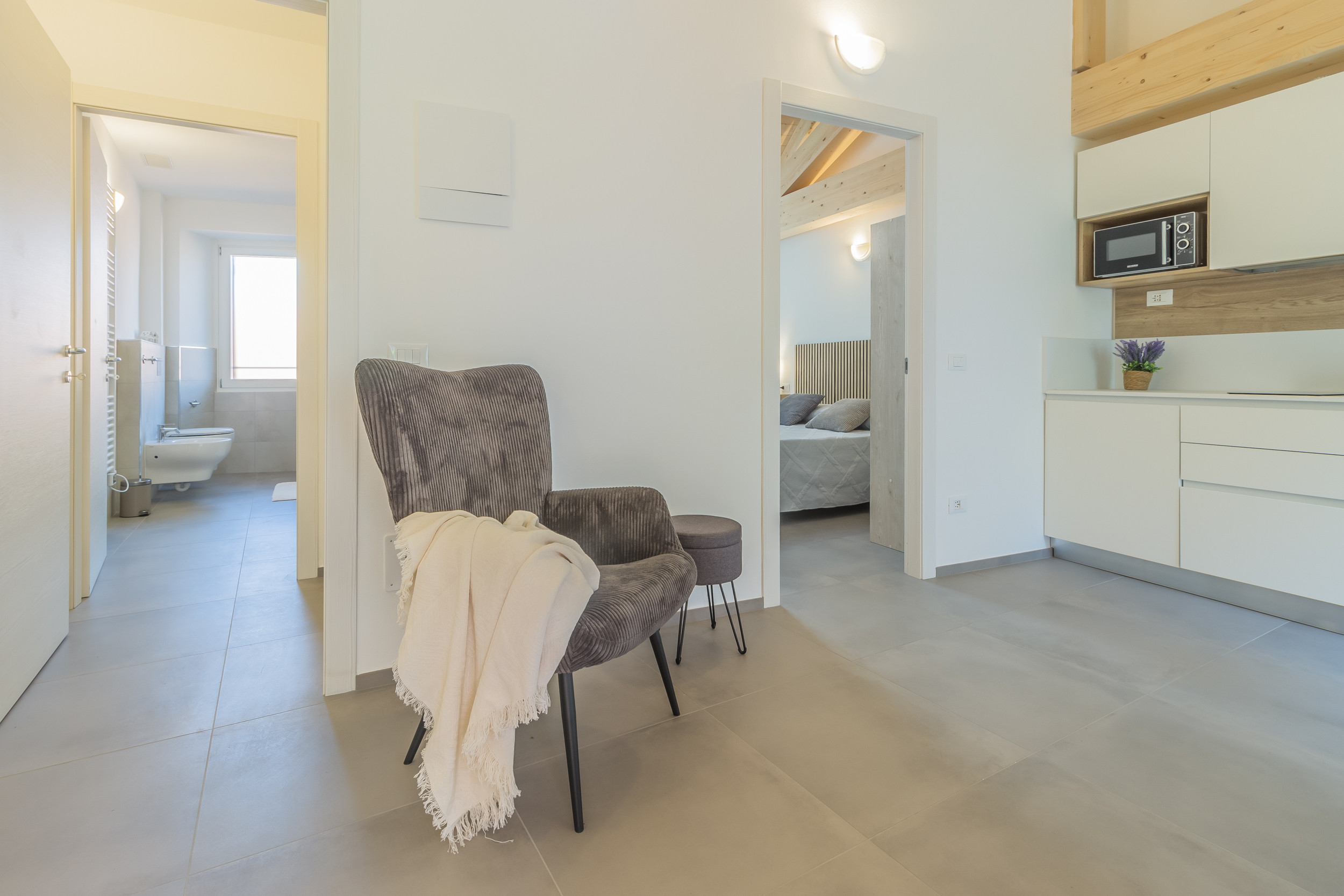 The apartment is located on the first floor and opens onto the living area, which features a comfortable armchair, dining table and a large kitchen with induction stove, equipped with dishwasher, microwave, kettle, toaster and all the tools needed to prepare tasty meals. The sleeping area consists of a room with a comfortable double bed and a bathroom complete with toilet, sink, bidet and shower.