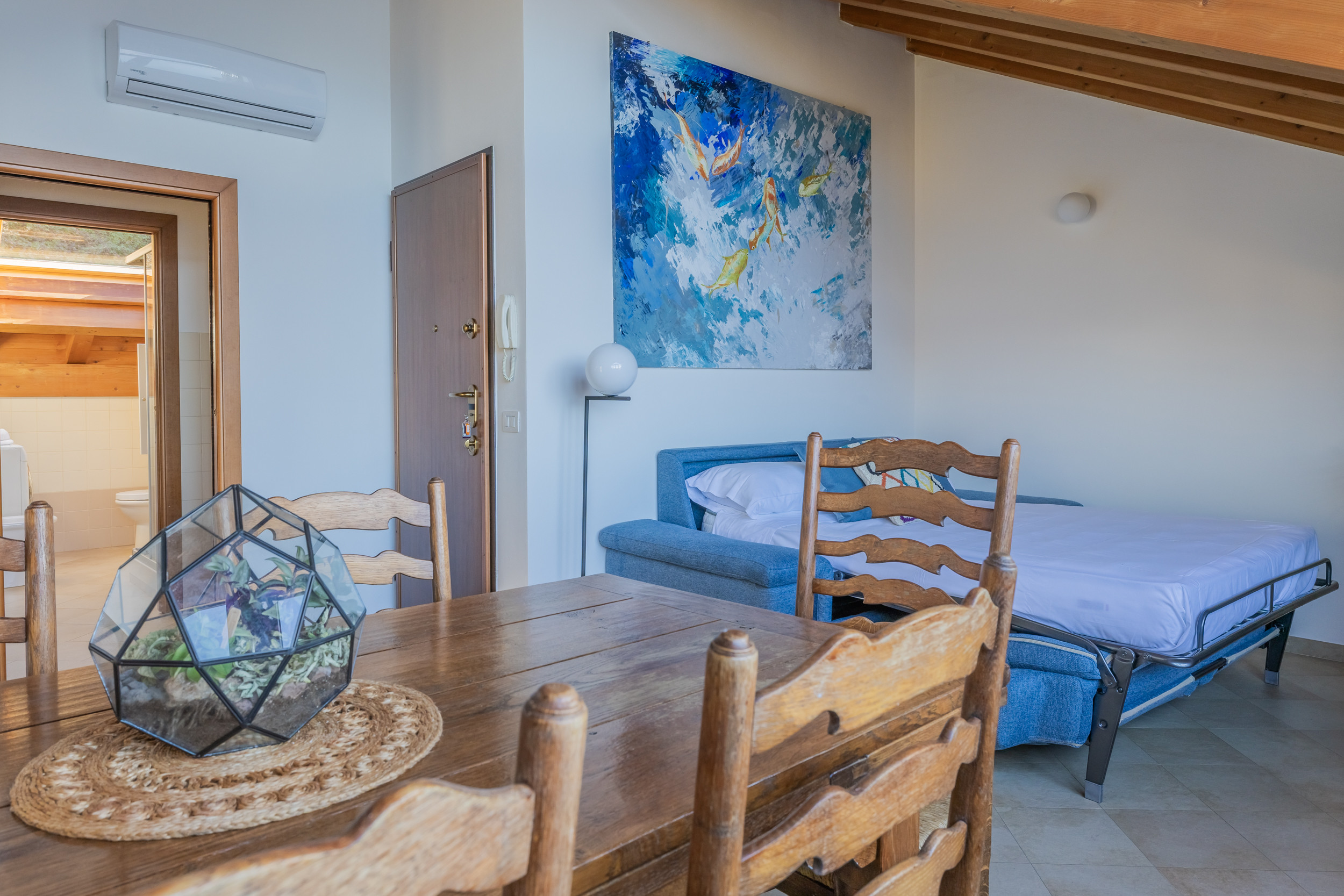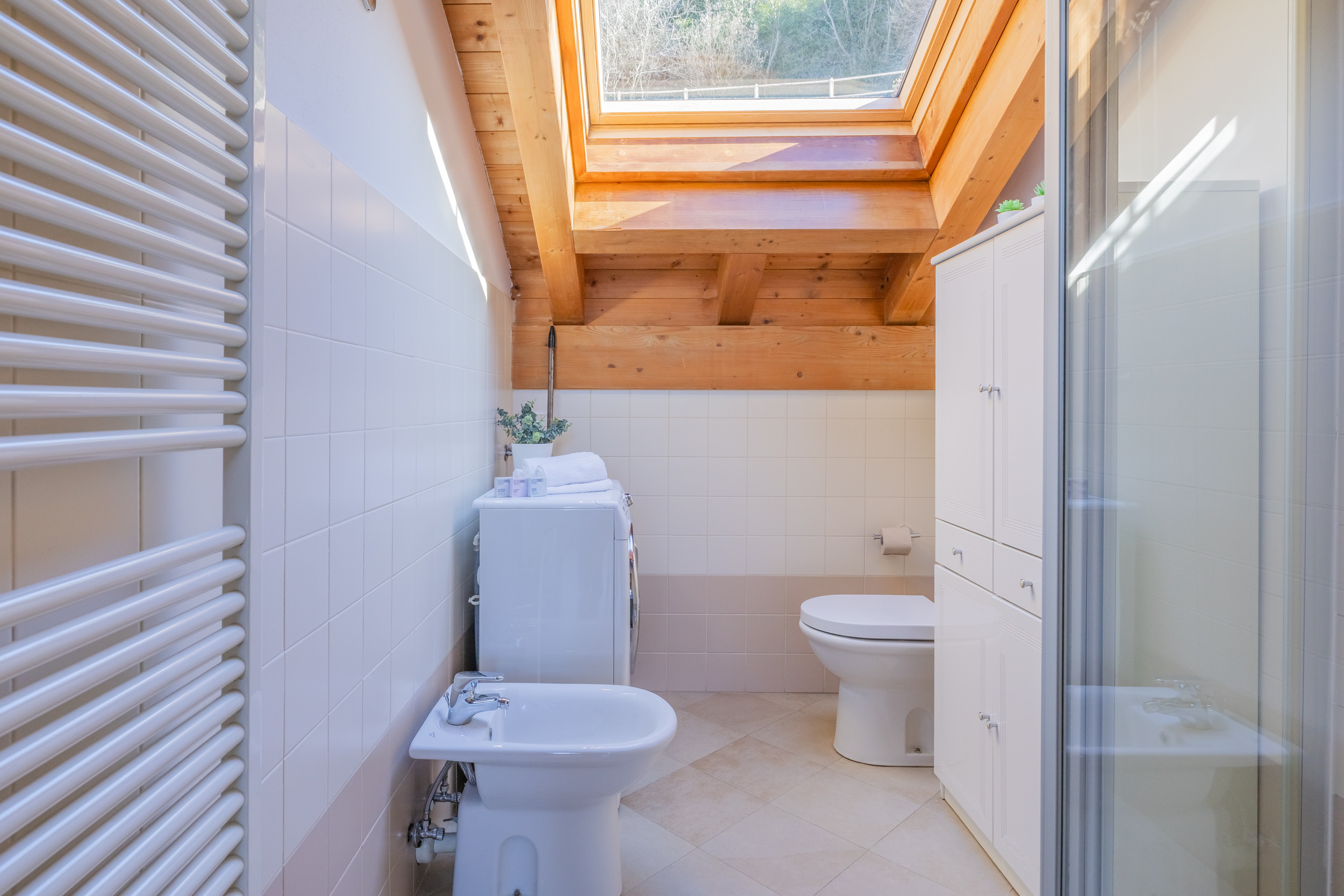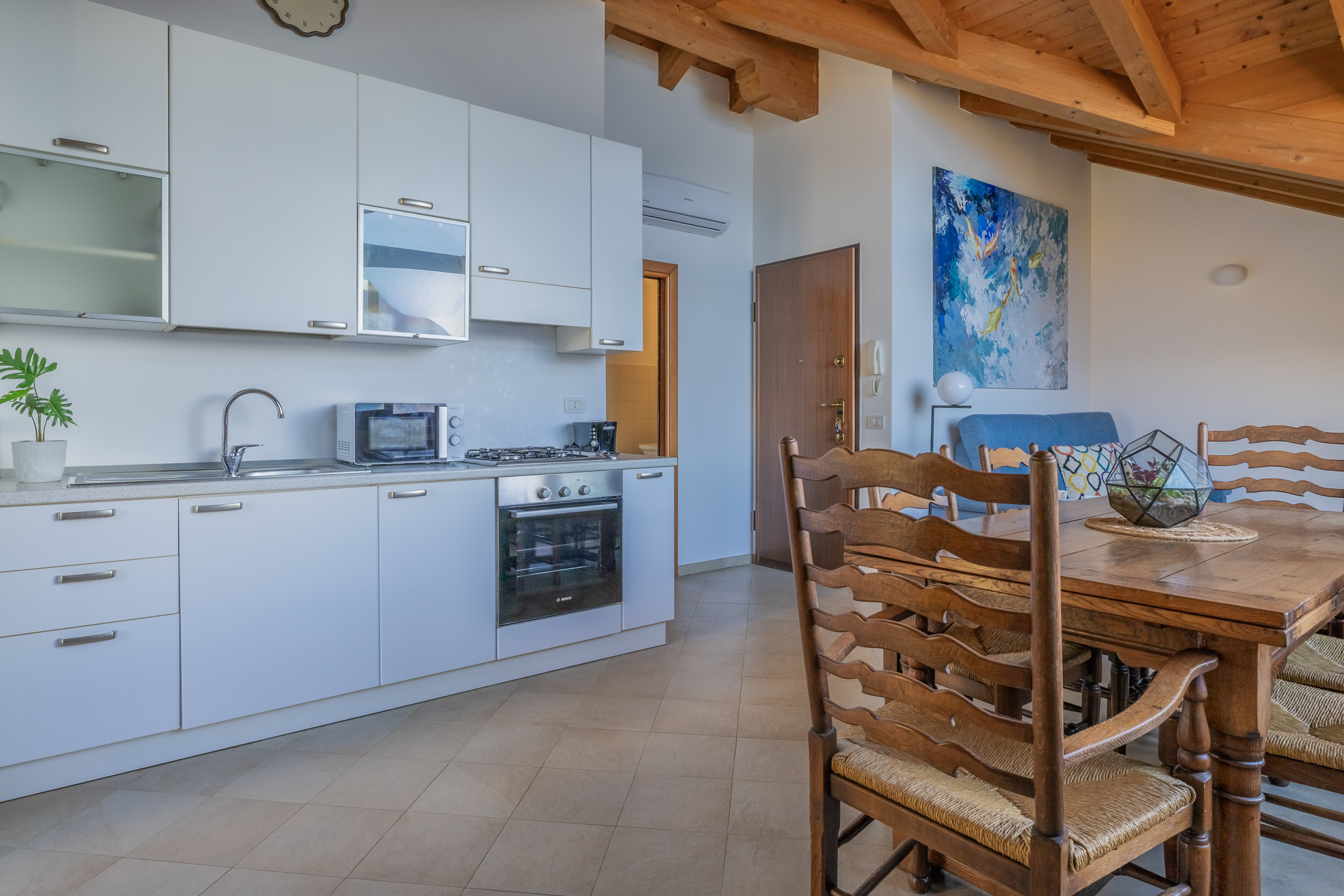 The interior of the house is furnished in a simple and comfortable way and very bright. The apartment is equipped with all comforts, such as fans, Wifi, washing machine, ironing board and iron, as well as a private garage where you can park your car.