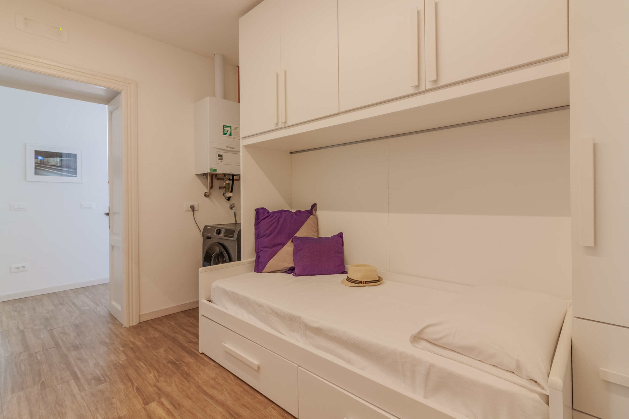 The apartment opens onto a hallway area where there is a single bed and washing machine.