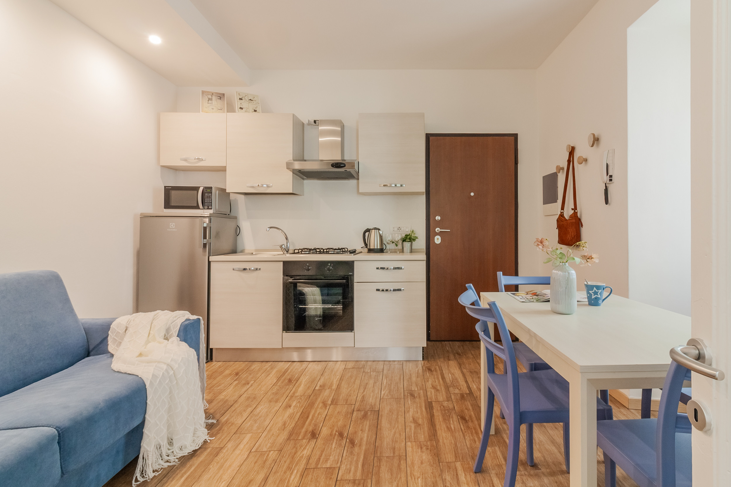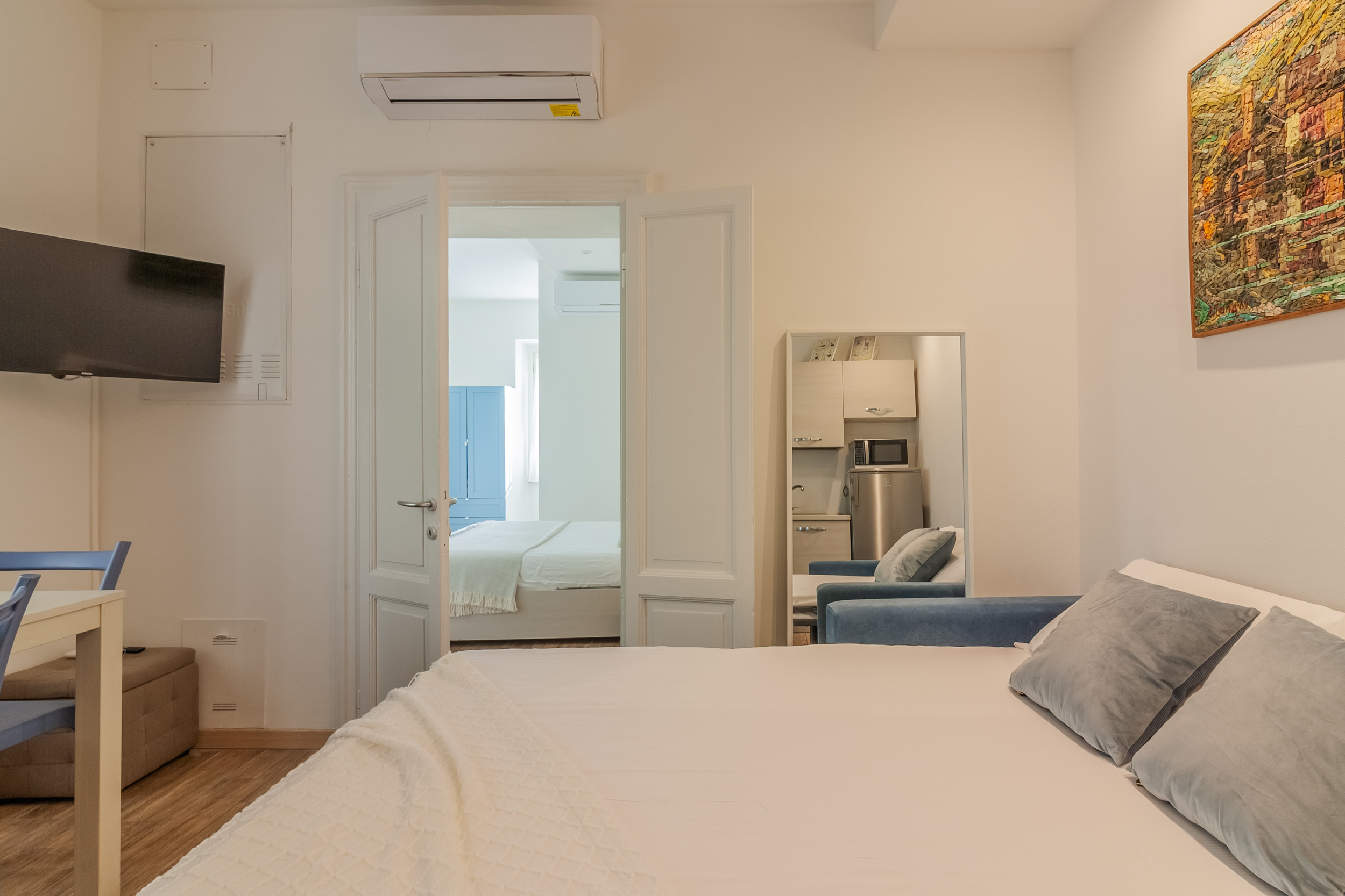 Entering the historic building, the apartment is on the first floor and its entrance opens into the living area, consisting of a comfortable double sofa bed, a dining table and an open kitchen, fully equipped with an oven, kettle, toaster, microwave and everything you need to prepare delicious meals.