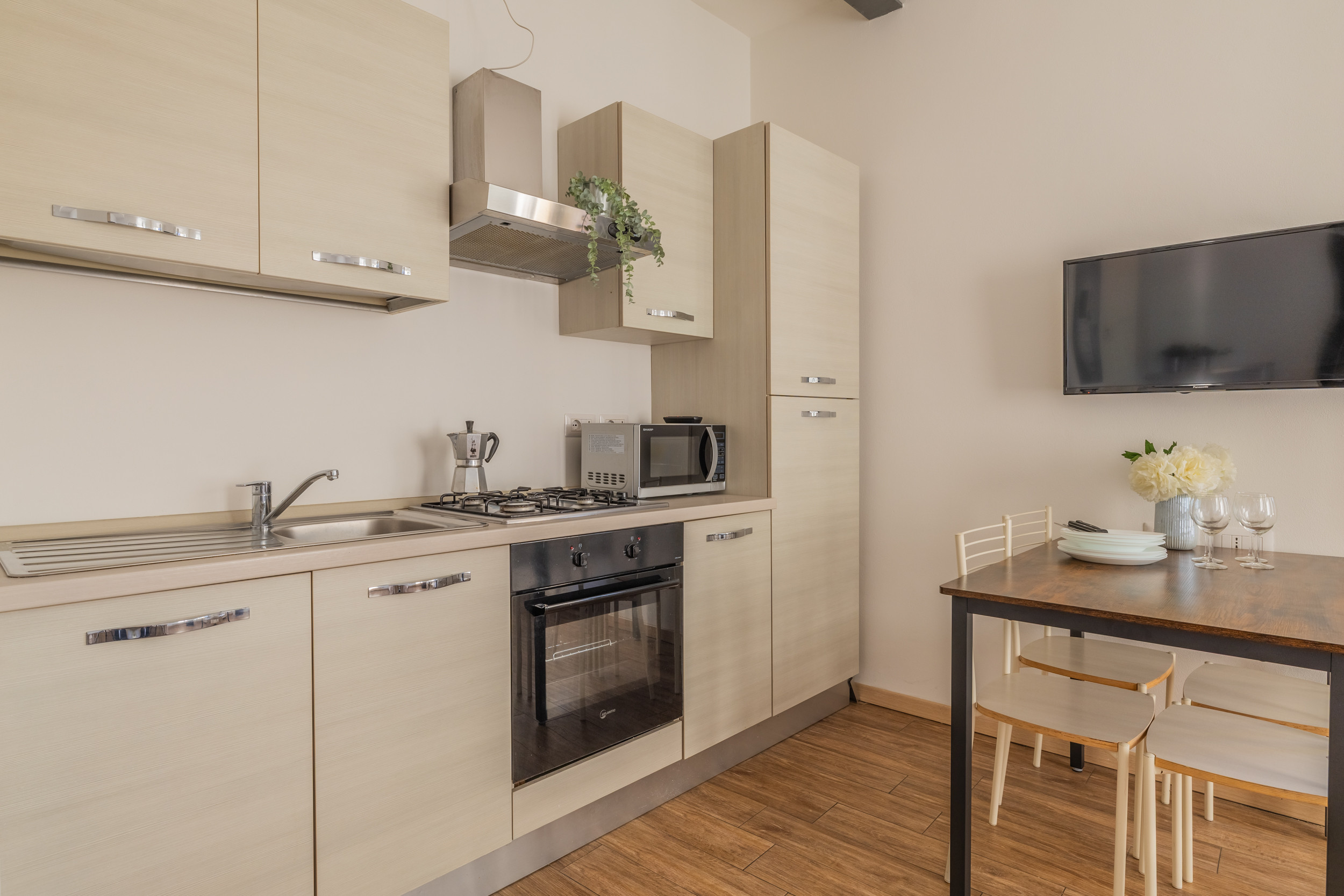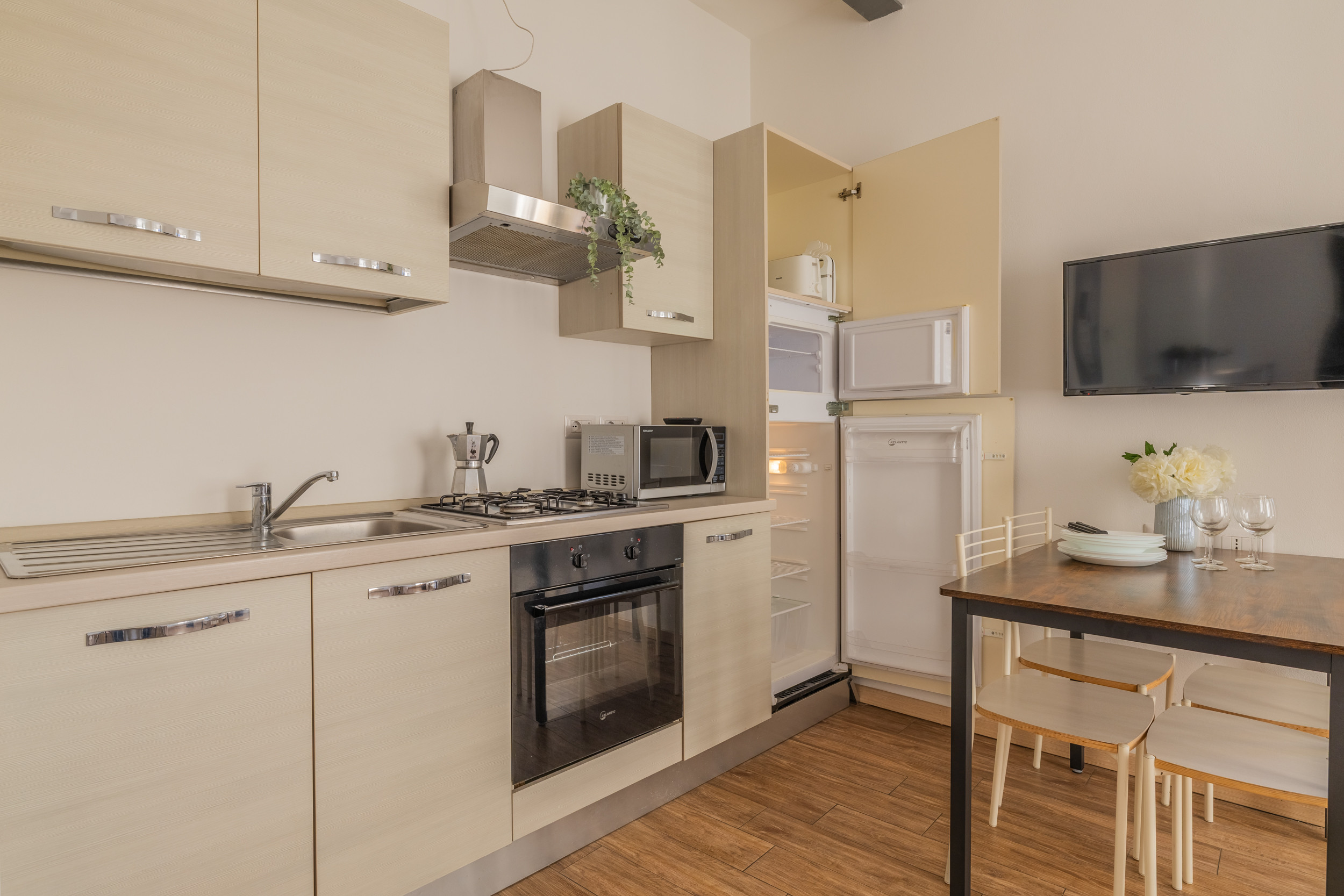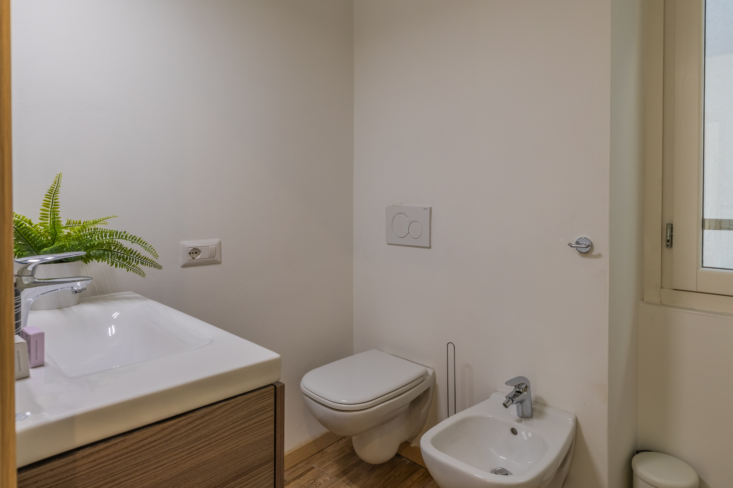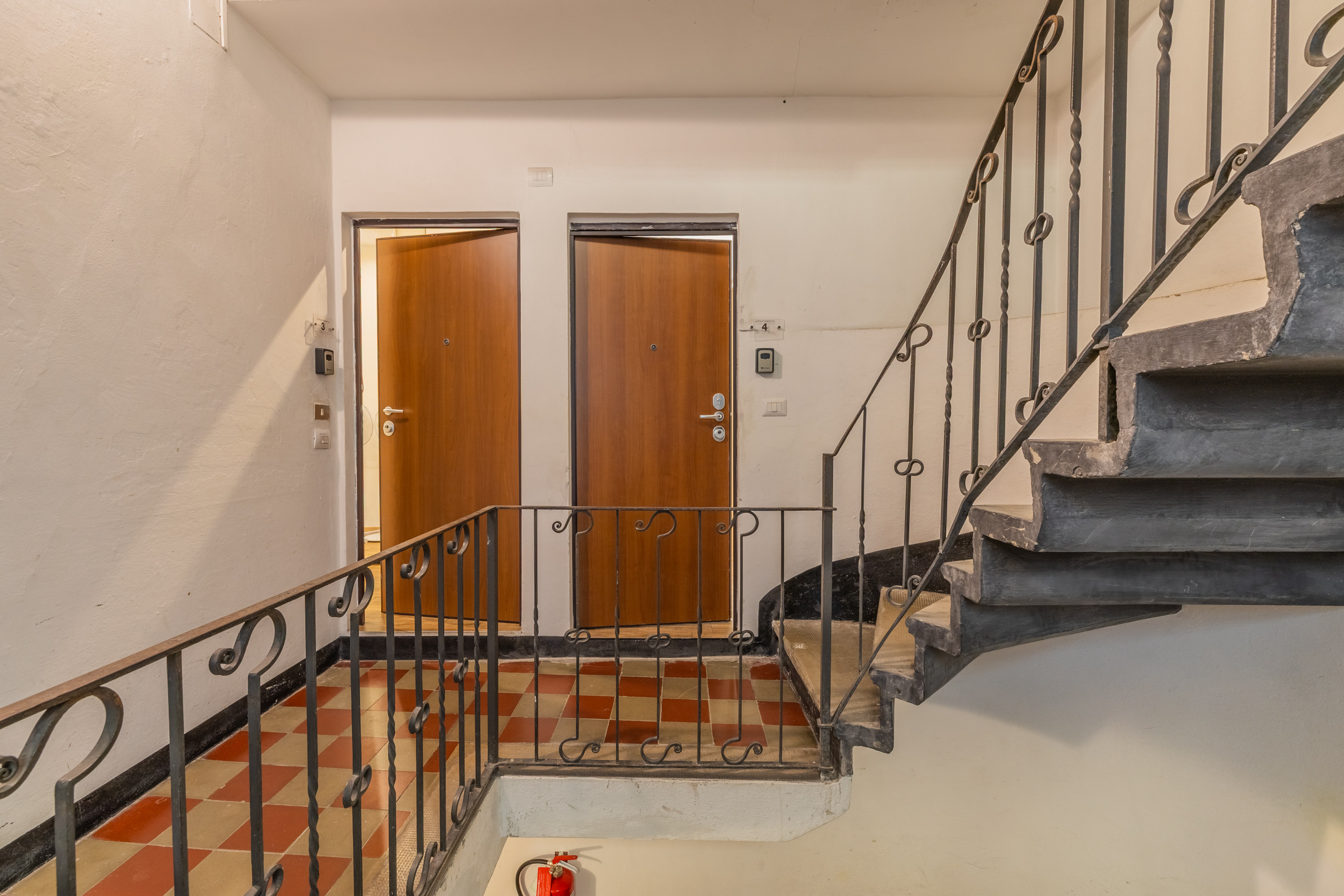 Entering the historic building, the apartment is on the first floor and its entrance opens onto a hallway that leads to the other rooms of the house and where the washing machine available to guests is located.