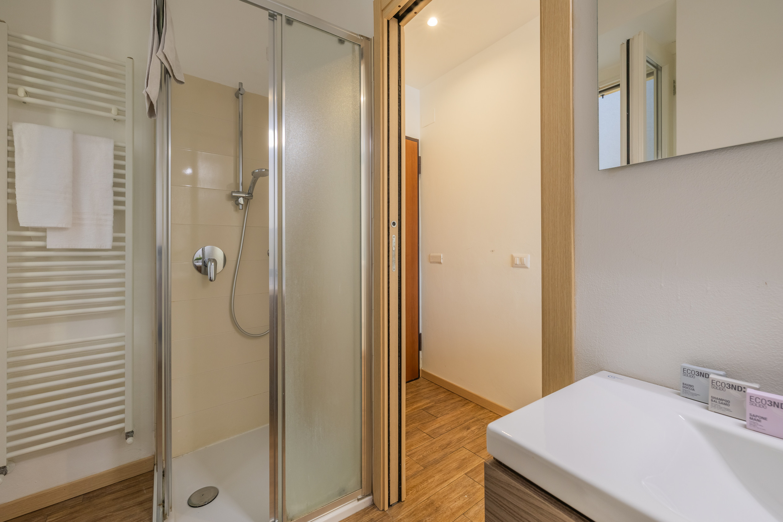 The sleeping area features an elegant double bedroom and a functional bathroom, with shower, sink and toilet.